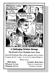 He began travelling hundreds of miles, crisscrossing the east coast of the United States. "Eventually," Phil said, "I found myself running out of preaching material. In plain fact, I needed more education, and I knew it." In 1937 he enrolled in Wheaton College in Illinois. In his senior year Phil met and fell in love with Ruth Brooker. After graduating in 1941, they were wed in the College Church. During this time he drew "Gary" (shown at left) which, according to a 22 November, 1941 advertisement in The Sunday School Times, was "the world's first Christian story strip." He followed this with the publication of two illustrated books: Two Mighty Men (1942) and Drawing Men to Christ (1943).