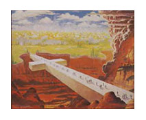 Despite his limited color vision, Phil made a number of oil paintings based on his chalk pictures. His most enduring image, "The Way of the Cross" (shown at left), was initially done in 1943 with several other versions painted later (the above image is from 1966). Inspired in part by an E. J. Pace cartoon of a cross bridging a chasm which he had seen in his childhood, well over 50,000 prints of this memorable scene have been sold.